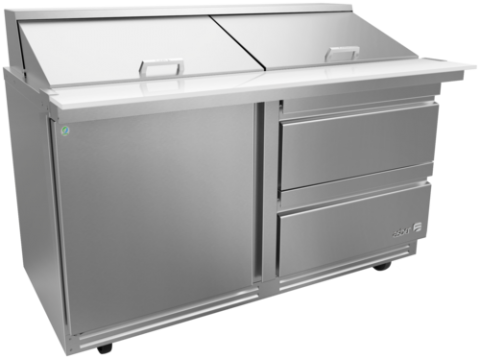 Premium Mega-Top Prep Table, 60-3/8"W x 36-1/8"D x 44-5/8"H, (2) stainless steel drawers, 20.6 cu. ft. capacity, 24 pans, 115V/60Hz, 1/4 HP, 2.5A, R290 hydrocarbon refrigerant, electronic controller, temperature range 32°F to 41°F, ambient up to 100°F/65% RH, Ecomate™ insulation, exclusive high-capacity base design, full stainless-steel exterior & interior, insulated lid, unique bottom air panel, fixed top/drawer pan dividers, high-strength slides, full-length recessed handles, magnetic one-piece door gaskets, 5" casters (front with brakes), NSF-7, ETL, DOE compliant, Made in North America.