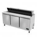 (19095230) Sandwich/Salad Top Prep Table, 72"W x 30"D x 43"H, self-contained refrigeration, (3) solid doors, (3) adjustable epoxy coated shelves, includes (18) standard full set of 1/6 size pans (4" deep), insulated lid, 10" removable/reversible white poly cutting board, temperature from 33° to 41°, stainless steel interior & exterior, galvanized back panel, 4" swivel casters (2 with brakes), R-290 hydrocarbon refrigerant, 1/4 HP, cETLus, ETL-Sanitation, Made in North America