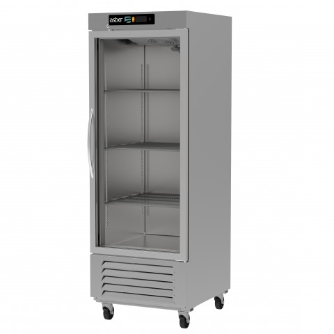 (19112950) Refrigerator, reach-in, one-section, 23 cu. ft. capacity, bottom mount self-contained refrigeration, (1) glass door, digital control, temperature range 32 °F to 38 °F, (3) adjustable epoxy coated shelves, LED interior lighting, stainless steel interior, stainless steel front & sides, 4" swivel casters (2 with brakes), R-290 Hydrocarbon refrigeration, 1/4 HP, cETLus, ETL-Sanitation, Made in North America