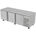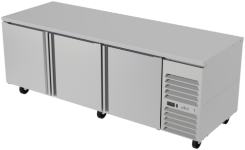 Side-Mount Refrigerated Table, 93-3/4"W x 36-1/8"D x 57"H, (4) stainless steel drawers, 30.2 cu. ft. capacity, 12 pans, 115V/60Hz, 1/3 HP, 3.0A, R290 hydrocarbon refrigerant, electronic controller with digital display, temperature range 32°F to 38°F, ambient up to 100°F/65% RH, Ecomate™ insulation, full stainless-steel exterior & interior, reversible condensing fan motor, hermetic compressor, epoxy-coated evaporator, fixed pan dividers, high-strength slides, full-length recessed handles, magnetic one-piece door gaskets, 5" casters (front with brakes), NSF-7, ETL, DOE compliant, Made in North America.
