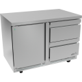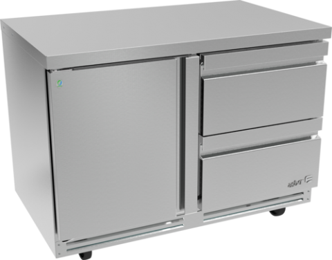 Premium Refrigerator Undercounter, 48-3/8"W x 30-1/8"D x 35-3/4"H, (2) stainless steel drawers, 16.7 cu. ft. capacity, 115V/60Hz., 1/4 HP, 2.5A, R290 hydrocarbon refrigerant, electronic controller with digital display, temperature range 32°F to 38°F, ambient up to 100°F/65% RH, Ecomate™ insulation, exclusive high-capacity base design, full stainless-steel exterior & interior, reversible condensing fan motor, hermetic compressor, epoxy-coated evaporator, fixed pan dividers, high-strength slides (88 lbs./drawer), full-length recessed handles, magnetic one-piece door gaskets, 5" casters (front with brakes), NSF-7, ETL, DOE compliant, Made in North America.