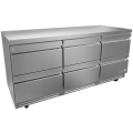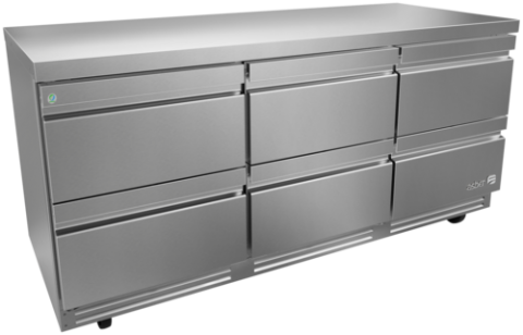 Premium Refrigerator Undercounter, 72-1/2"W x 30-1/8"D x 35-3/4"H, (6) stainless steel drawers, 25.4 cu. ft. capacity, 115V/60Hz., 1/4 HP, 2.5A, R290 hydrocarbon refrigerant, electronic controller with digital display, temperature range 32°F to 38°F, ambient up to 100°F/65% RH, Ecomate™ insulation, exclusive high-capacity base design, full stainless-steel exterior & interior, reversible condensing fan motor, hermetic compressor, epoxy-coated evaporator, fixed pan dividers, high-strength slides (88 lbs./drawer), full-length recessed handles, magnetic one-piece door gaskets, 5" casters (front with brakes), NSF-7, ETL, DOE compliant, Made in North America.