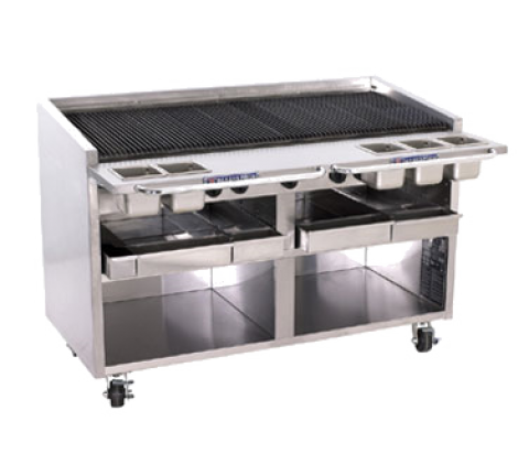 Radiant Charbroiler, floor model, gas, 60"W x 39-1/2"H, free floating round rod top grate, EZ tilt to front grease trough, coal radiants with Glo-Stones, 6" service shelf with utility bar, water tubs, includes top grid scraper, stainless steel construction, open cabinet base, 6" adjustable legs, CSA Flame, CSA Star, NSF