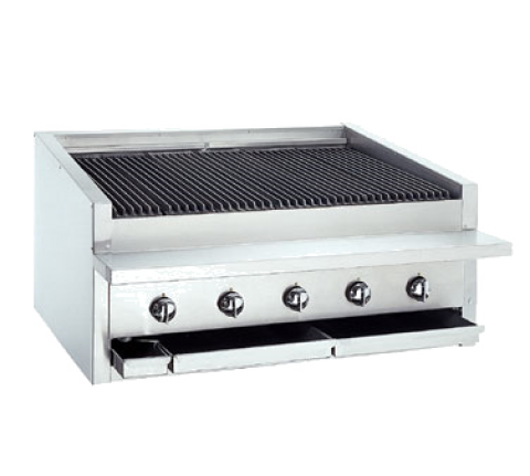 Radiant Charbroiler, countertop, gas, 36"W x 13"H, free floating round rod top grate, EZ tilt to front grease trough, coal radiants with Glo-Stones, 6" service shelf, includes top grid scraper, stainless steel on all sides, CSA Flame, CSA Star, NSF