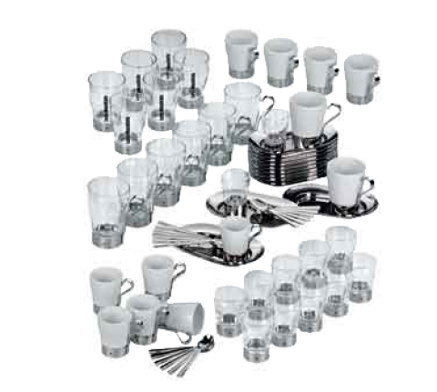 Allround Coffee Set, includes: (12) 7-1/2" x 4-3/4" 18/10 stainless steel serving trays, (6) 11.2 oz. large printed glasses, (6) 11.2 oz. large unprinted glasses, (12) 3.2 oz. small glasses, (6) 8.45 oz. medium porcelain cups, (6) 3.2 oz. small porcelain cups, (6) large 18/10 stainless steel rings, (12) small 18/10 stainless steel rings, (6) large 18/10 stainless steel handles, (6) medium 18/10 stainless steel rings, (6) small 18/10 stainless steel handles, (6) 6-1/4" 18/10 stainless steel mug spoons, (6) 5-1/4" 18/10 stainless steel tea/coffee spoons & (6) 4-14" 18/10 stainless steel demitasse spoons, CoffeeCulture by WMF