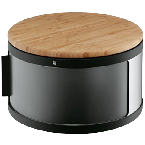 Bread Bin, 12-3/5" dia. x 7-1/2"H, round, includes (1) removable bamboo cutting board, Cromargan® 18/10 stainless steel, glass, & plastic, black, WMF