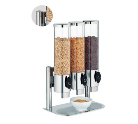 Cereal Dispenser, triple dispensers, 354.9 oz. (118.3 oz. each dispenser), 15-1/4" x 9-3/4" x 23-1/2", dishwasher safe, 18/10 stainless steel top & base, PMMA dispenser, clear, Basic, Change by WMF