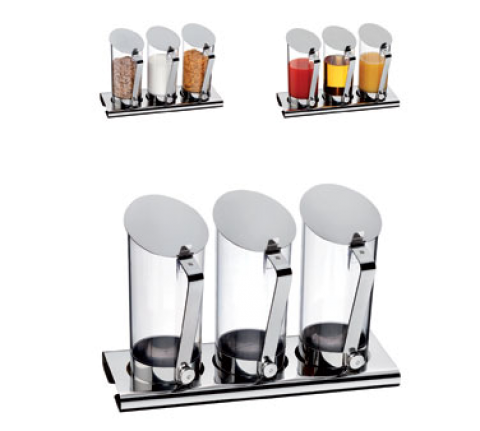 Cereal/Juice/Milk Dispenser Set, includes: 17-1/2" x 6-3/4" x 1-1/4" rectangular 18/10 stainless steel base, (3) 67.6 oz. clear SAN containers, by WMF
