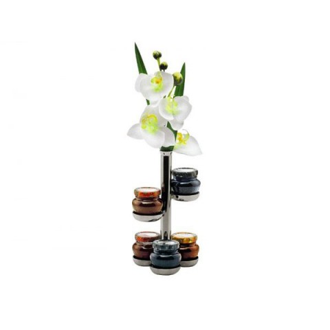 Stand, 7-7/8"H (200 mm), 2-tier, 5-part, with vase, for jam glasses, 18/10 stainless steel, silver plate finish, Hepp
