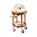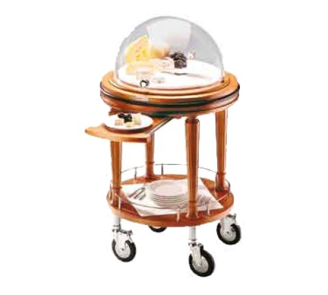 Cheese Trolley, 24-7/16" dia. (620mm) x 31-1/2"H (800mm), 1/2 roll top plexi-glass lid, 17-11/18" dia. plastic revolving cutting board, sliding shelf, bottom shelf gallery, natural wood, Elegance by Hepp