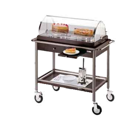 Pastry/Dessert Trolley, 39-3/4"L (1010mm) x 20-7/8"W (530mm) x 43-11/16"H (1110mm), plexi-glass lid, 18/10 stainless steel top with (6) cooling pellets, sliding shelf & drawer, natural wood, Profile by Hepp