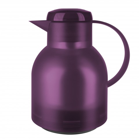 Beverage Server, 1 liter (33.8 oz.), 7" x 5-11/16" x 8-1/2"H, heat/cold retention: 12/24 hours, quick press closure, glass liner, vacuum insulated, dent/scratch resistant, leak-proof, polypropylene, translucent aubergine, Samba, Emsa, Made in Germany