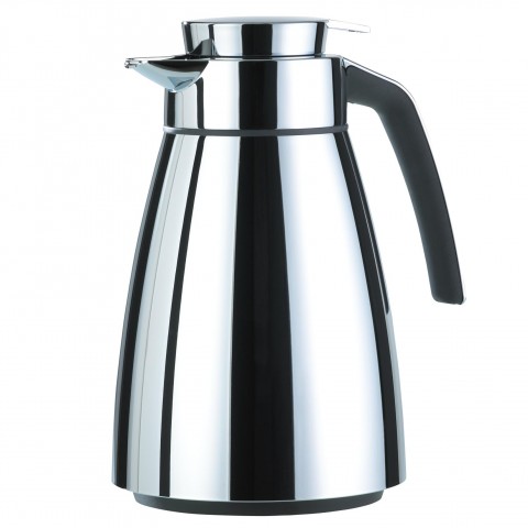 Beverage Server, 1 liter (33.8 oz.), 7-9/16" x 6-1/8" x 9-7/8"H, heat/cold retention: 12/24 hours, quick tip closure, glass liner, soft touch handle, vacuum insulated, dent/scratch resistant, leak-proof, ABS plastic, chrome, Bell, Emsa