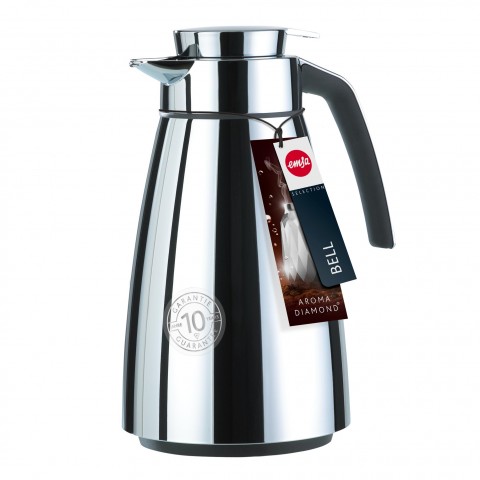 Beverage Server, 1-1/2 liter (50.7 oz.), 7-13/16" x 6-9/16" x 11-1/4"H, heat/cold retention: 12/24 hours, quick tip closure, glass liner, soft touch handle, vacuum insulated, dent/scratch resistant, leak-proof, ABS plastic, chrome, Bell, Emsa