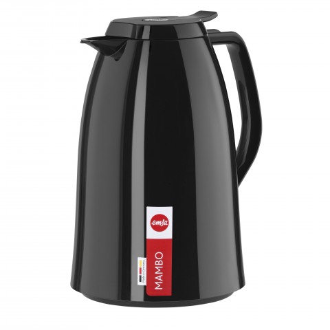 Beverage Server, 1-1/2 liter (50.7 oz.), 7-1/2" x 6-9/16" x 9-7/8"H, heat/cold retention: 12/24 hours, quick tip closure, glass liner, vacuum insulated, dent/scratch resistant, leak-proof, polypropylene, shiny black, Mambo, Emsa, Made in Germany