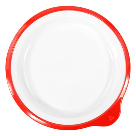 Low Plate, 4-1/2 oz., 6-7/10"W x 7-1/5"D x 4/5"H, round, with rim and sensory handle, lightweight, dishwasher safe, melamine, white with red rim, Omni by Dalebrook