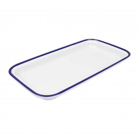 Enamelware Collection Tray, GN 1/3 size, 12-3/4"L x 7"W x 1-1/4"H, rectangular, blue rim, anti-slip silicone feet, chip and stain resistant, dishwasher safe, melamine, white, Dalebrook (500 each minimum order) MOQ 500