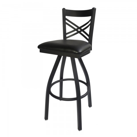 Akrin Swivel Barstool, cross back, upholstered padded seat, footrest, metal frame with sand black finish, grade 3 uph.