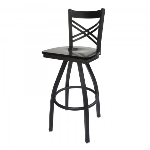 Akrin Swivel Barstool, cross back, wood seat, footrest, metal frame with sand black finish