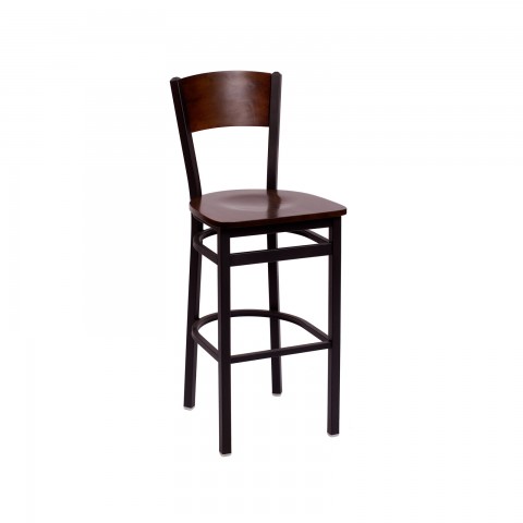 Dale Barstool, solid wood back, wood seat, footrest, metal frame with sand black finish