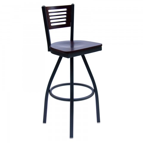 Espy Swivel Barstool, slotted wood back, upholstered padded seat, footrest, metal frame with sand black finish, grade 1 uph.