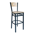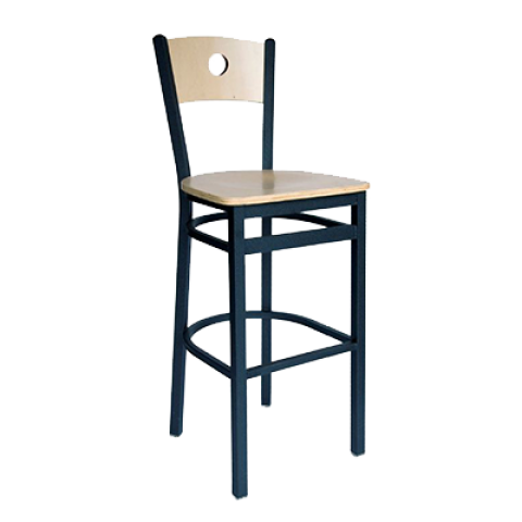Darby Barstool, circle wood back, wood seat, footrest, metal frame with sand black finish