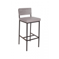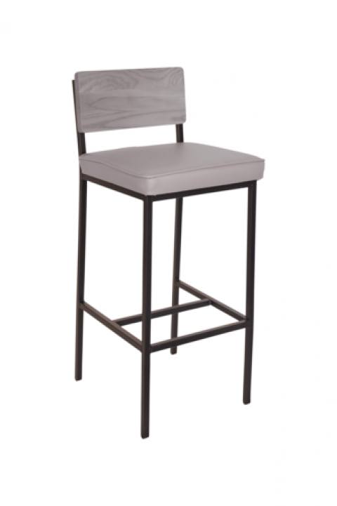 Memphis Barstool, gray ash wood back, upholstered box seat, footrest, steel frame with distressed finish, grade 4 uph.