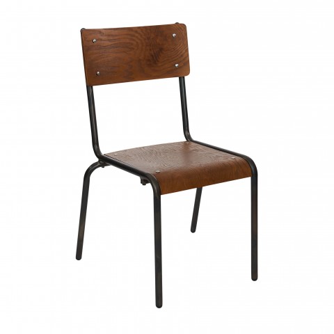 Nash Side Chair, industrial design, ash wood veneer over bent plywood seat and back, steel tube frame with clear distressed powder coat finish, autumn ash stain finish