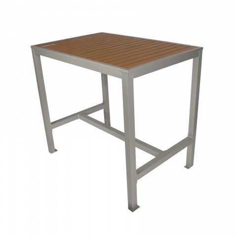 Longport Table, 32" x 48", rectangle, bar height, (4) leg bolt down base, synthetic teak top, outdoor/indoor, powder coated aluminum frame with silver finish