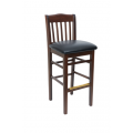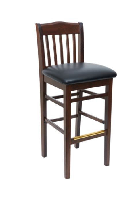 Columbia Barstool, classic school house design, European Beechwood construction, upholstered seat, footrest with kickplate, dark walnut finish, grade 4 uph.