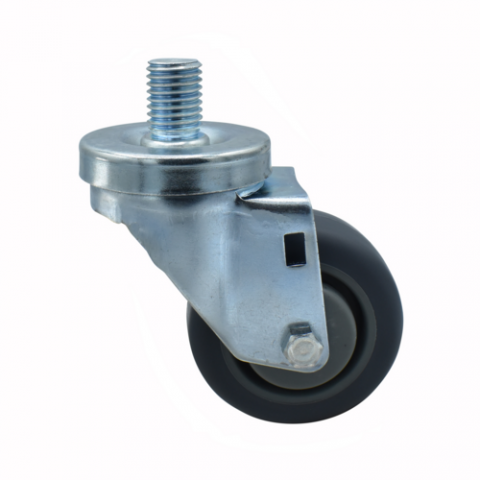 Rubber Wheel, 3" diameter, 3/4"-10 x 1" threaded stem, without brake, non-marking, 250 lb. weight capacity, operational temp range -45° to 180°F, resistant to oil, grease, water &most solvents, double ball bearing, smooth and quiet, zinc plated, gray, NSF