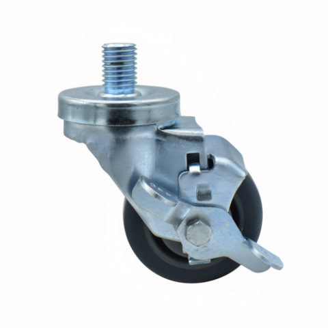 Rubber Wheel, 3" diameter, 3/4"-10 x 1" threaded stem, with top lock brake, non-marking, 250 lb. weight capacity, operational temp range -45° to 180°F, resistant to oil, grease, water &most solvents, double ball bearing, smooth and quiet, zinc plated, gray, NSF