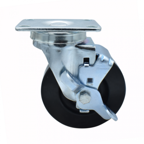 Hard Rubber Wheel, 4" diameter, 2-3/8" x 3-5/8" top plate, with top lock brake, 1/2" king pin, 300 lb. weight capacity, operational temp range -40° to 160° F, nylon bearing sleeve, double ball bearing, zinc plated, , NSF