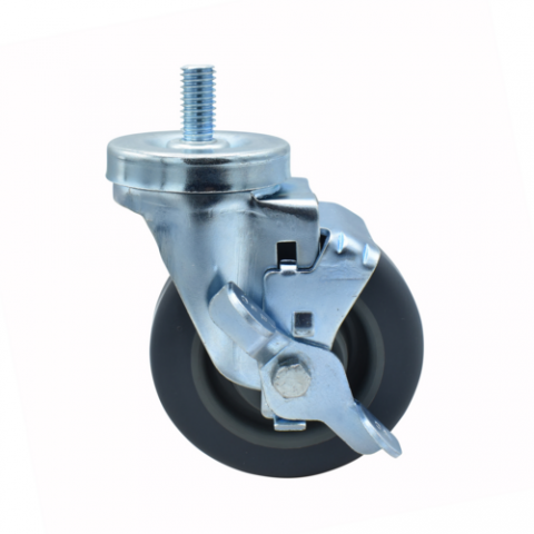 Rubber Wheel, 4" diameter, 1/2"-13 x 1" threaded stem, with top lock brake, non-marking, 250 lb. weight capacity, operational temp range -45° to 180°F, resistant to oil, grease, water &most solvents, double ball bearing, smooth and quiet, zinc plated, gray, NSF