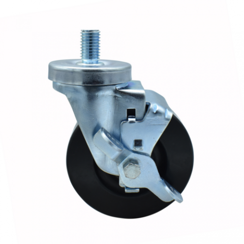 Hard Rubber Wheel, 4" diameter, 5/8"-13 x 1" threaded stem, with top lock brake, 300 lb. weight capacity, operational temp range -40° to 160° F, nylon bearing sleeve, double ball bearing, zinc plated, , NSF
