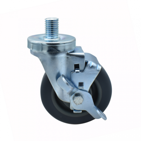 Rubber Wheel, 4" diameter, 3/4"-10 x 1" threaded stem, with top lock brake, non-marking, 250 lb. weight capacity, operational temp range -45° to 180°F, resistant to oil, grease, water &most solvents, double ball bearing, smooth and quiet, zinc plated, gray, NSF