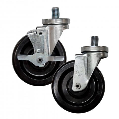 Oven Caster Kit, 5" diameter, 3/4" x 10 x 1" threaded stem, (2) without brake & (2) with top lock brake, phenolic tread, 350 lb. capacity, resistant to oil & grease, double ball bearing, smooth & quiet, operational temp range -50° to 250° F, zinc plated, NSF (4 per kit)