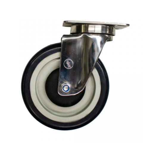 Caster, 5" diameter swivel plate, non-marking polyurethane tread, without brake, 300 lb. capacity, resistant to acids & caustics, 2-3/8" x 3-5/8" top plate, 1/2" king pin, double ball bearing, operational temp range -45° to 180° F, stainless steel rig, NSF