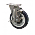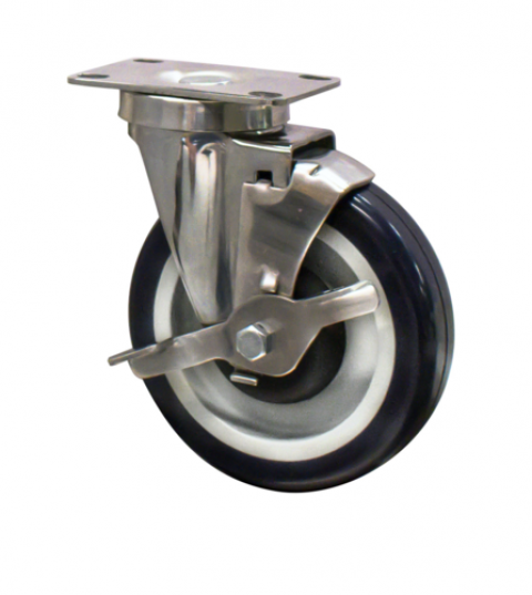 Caster, 5" diameter swivel plate, non-marking polyurethane tread, toe lock brake, 300 lb. capacity, resistant to acids & caustics, 2-3/8" x 3-5/8" top plate, 1/2" king pin, double ball bearing, operational temp range -45° to 180° F, stainless steel rig, NSF