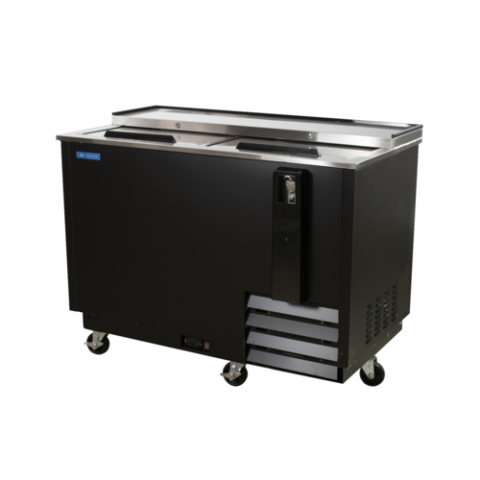Horizontal Deep Well Bottle Cooler, 95", (3) doors, (5) dividers, (55) case of 12 oz. cans, (37.5) case of 12 oz. bottles, heavy duty construction, (1) removable bottle cap opener & catcher, electronic control system, eco-friendly hydro-carbon refrigerant, temp range 33ºF to 38ºF, adjustable coated-steel dividers, 4" swivel casters, black vinyl exterior, ETL, ETL Sanitation