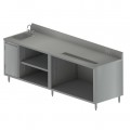 Beverage Table, 96"W x 30"D, 14" x 10" sink on left with BKF-4DM-3G-G gooseneck faucet, 14 gauge stainless steel top, 18 gauge stainless steel body, built-in 38" urn trough with drain, (1) hinged door under sink, (2) undercounter compartments, one with adjustable shelf, 5" riser backsplash with standard electric outlet, stainless steel legs, NSF (3-10 day lead time)