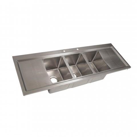 Drop-In Sink, three compartment, 58-1/8"W x 20"D x 10-5/8"H overall size, (3) 10" wide x 14" front-to-back x 10" deep compartments, (2) 12" drainboards on left & right, marine edge, includes (1) deck mount faucet (BK8D-8G-G) & (3) basket drains (BKDR-4), 18/304 stainless steel construction, 57-3/8" x 19-1/2" cutout required, lead free, NSF