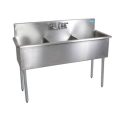 Budget Sink, three compartment, 57"W x 24-1/2"D x 41"H overall size, 18” wide x 21” front-to-back x 12" deep compartments, 8"H backsplash, 8" OC splash mount faucet holes, 1-1/2" rolled edges on front & sides, square corners, includes basket drains (BKDR-4), 18/430 stainless steel construction, galvanized steel legs with adjustable high-impact corrosion-resistant feet