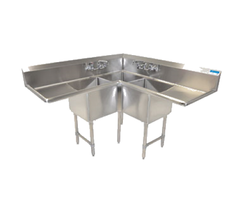 Corner Sink, three compartment, 75"W x 75"D x 43-1/2"H overall size, 24" wide x 24" front-to-back x 14" deep compartments, (2) left & right 24" drainboards, 9"H backsplash, (2) sets of 8" OC faucet holes, 1-1/2" rolled edges on front & sides, includes drain baskets, 18/304 stainless steel construction, galvanized steel legs, adjustable high impact corrosion resistant feet, NSF