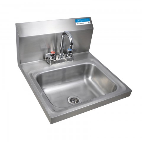 Hand Sink, wall mount, 14" wide x 10" front-to-back x 5" deep bowl, 4" O.C deck mount faucet (BKD-3G-G, lead free), marine edge, includes basket drain & wall mounting hardware, 304 stainless steel construction, NSF