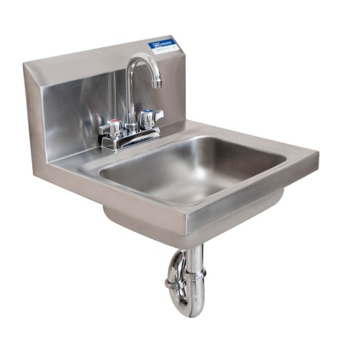 Hand Sink, wall mount, 14" wide x 10" front-to-back x 5" deep bowl, 4" O.C. deck mount faucet holes with (1) BKD-3G-G faucet, P-trap, color coded hot & cold indicators, 1/4 turn ceramic cartridges, 1-7/8" basket drain with crumb cup, wall bracket included, 304 stainless steel, NSF