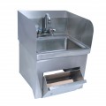 Hand Sink, wall mount, 14" wide x 10" front-to-back x 5" deep bowl, 4" OC deck mount faucet (BKD-3G-G), integrated towel dispenser on front, side splashes on left & right, includes basket drain (BKDR-2) & wall mounting hardware, 304 stainless steel construction, NSF