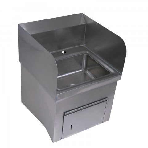 Hand Sink, wall mount, 14" wide x 10" front-to-back x 5" deep bowl, 4" OC deck mount faucet holes, integrated towel dispenser on front, side splashes on left & right, includes basket drain (BKDR-2) & wall mounting hardware, 304 stainless steel construction, NSF