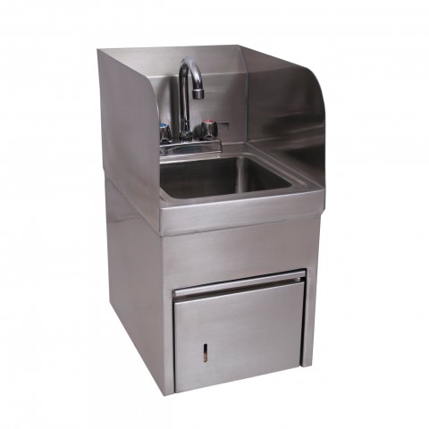 Hand Sink, wall mount, 9" wide x 9" front-to-back x 5" deep bowl, 4" OC deck mount faucet (BKD-3G-G), integrated towel dispenser on front, side splashes on left & right, 8"H backsplash, includes basket drain (BKDR-2) & wall mounting hardware, 304 stainless steel construction, NSF