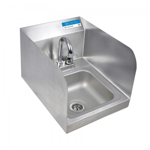 Space Saver Hand Sink, wall mount, 9" wide x 9" front-to-back x 5" deep bowl, 4" OC deck mount faucet (BKD-3G-G, lead free), marine edge, side splashes on left & right, 7-1/2"H backsplash, includes basket drain & wall mounting hardware, 304 stainless steel construction, NSF